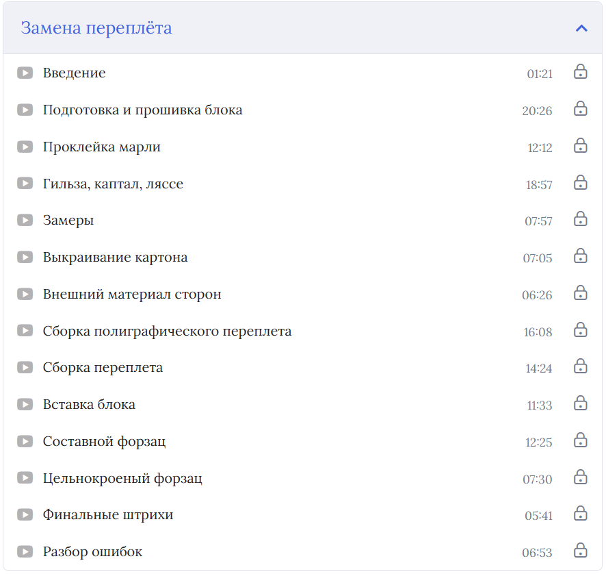 Модуль построен так, чтобы вы могли шаг за шагом освоить полную замену переплёта в домашних условиях, без применения специального оборудования и дорогостоящих материалов.